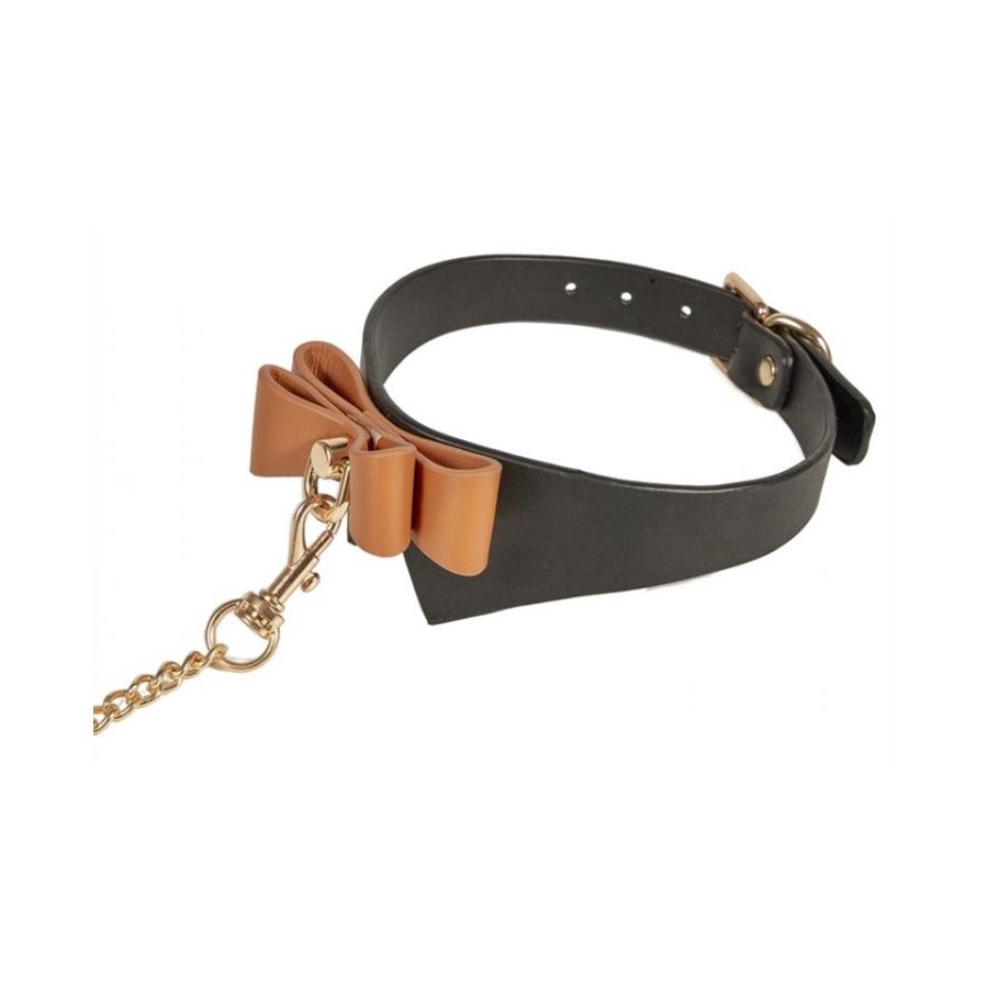 La laisse, les mousquetons et l’anneau sont en métal doré. Le collier est chic et coquin avec son nœud marron.