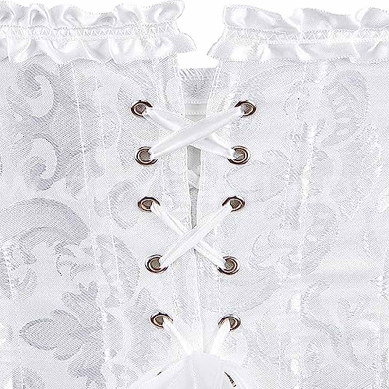 Doté d’une fermeture à l’avant par de petits crochets délicats, ce corset est facile à enfiler et offre un ajustement parfait. De plus, son laçage à l’arrière permet de le cintrer à votre convenance, offrant ainsi un maintien ferme et confortable. Les baleines intégrées dans sa structure assurent une silhouette parfaitement sculptée et une posture impeccable. Ce corset bustier blanc brodé est dépourvu de bretelles, offrant ainsi des épaules dégagées pour un look à la fois sensuel et séduisant. Les froufrous, délicatement disposés sur le haut et le bas du corset, ajoutent une touche de romantisme et de féminité à l’ensemble.