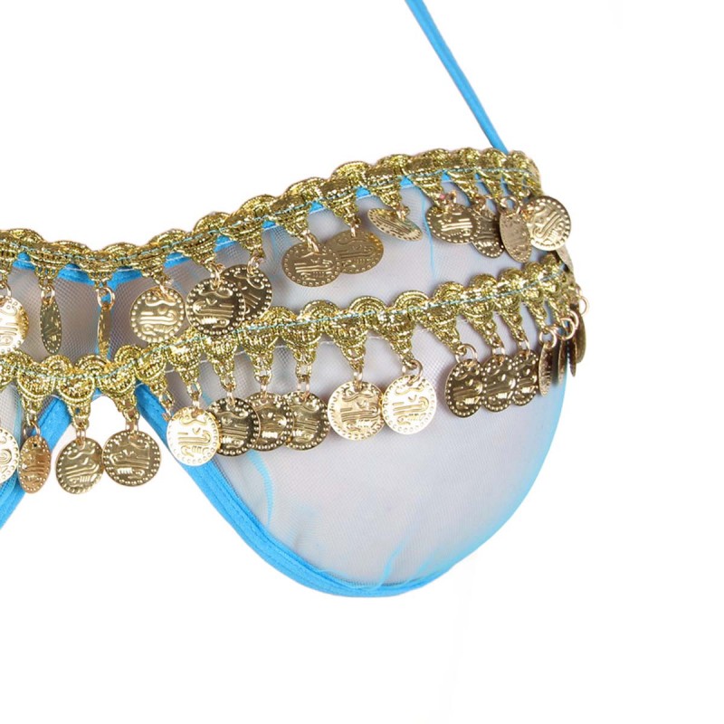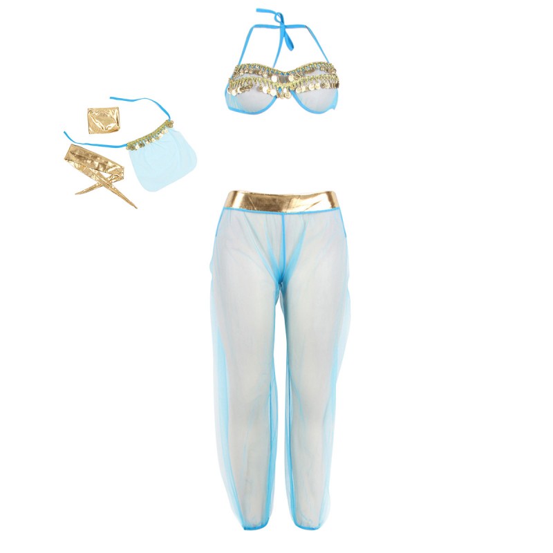 Ce déguisement Mille et Une Nuit est conçu avec des détails exquis qui mettent en valeur vos courbes féminines. Le bas, un pantalon fluide est ouvert sur les côtés. Le tulle bleu transparent laisse entrevoir subtilement votre peau, tandis que la ceinture élastique dorée souligne votre taille. Le haut est composé d’une brassière en tulle bleue décoré d’un galon doré avec des pièces métalliques. Le soutien-gorge se noue dans le dos. Le voile autour du visage apporte une touche de mystère et d’élégance. Enfin un brassard et un bandeau couleur or complètent ce déguisement femme. Vous serez la reine des nuits érotiques avec ce costume envoûtant.