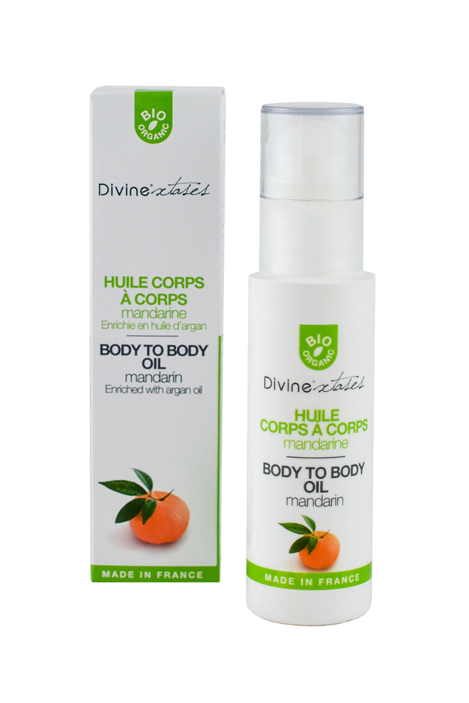 Huile corps à corps 100% bio à l’arôme naturel de mandarine et enrichie en huile d’argan de la marque Divinextases.