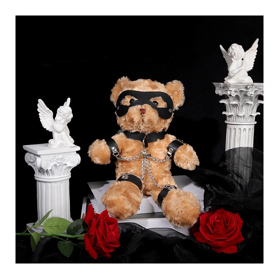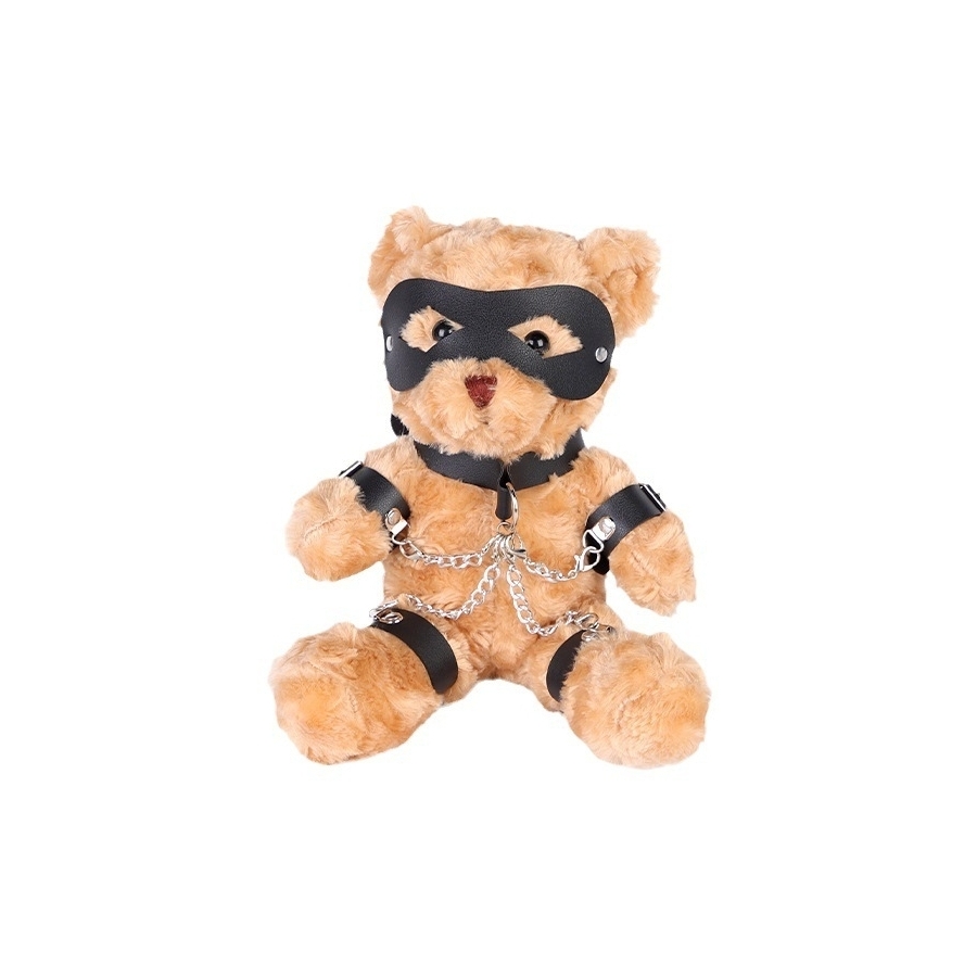 Cet ourson en peluche est équipé d’un masque, d’attaches de bras et de cuisses, ainsi que d’une laisse autour du cou reliée par des chaînes.