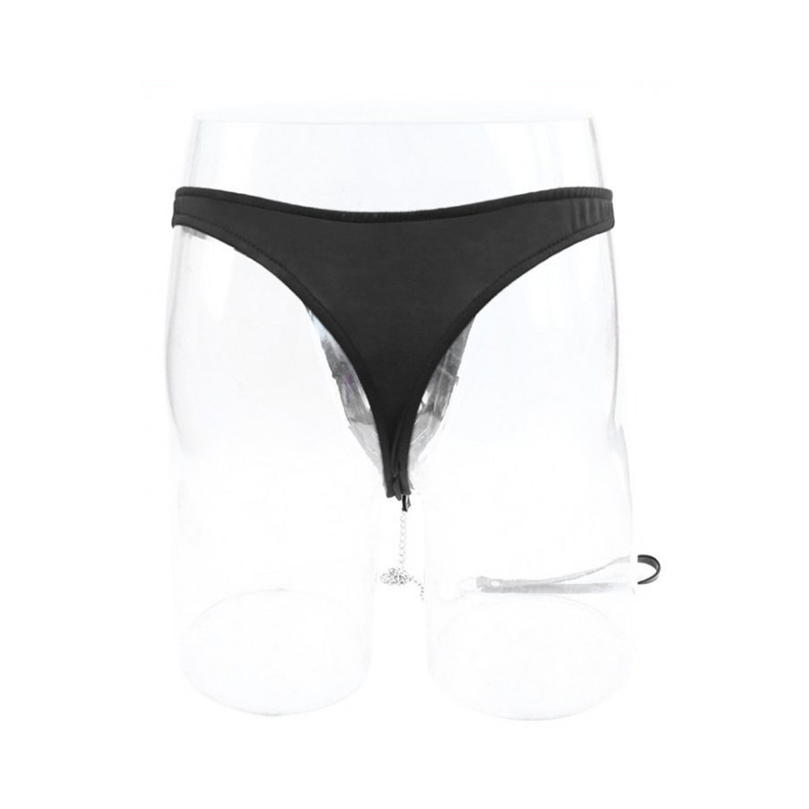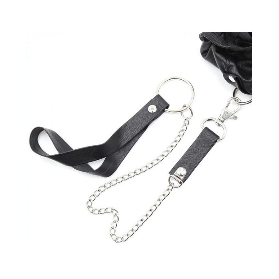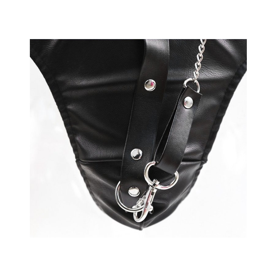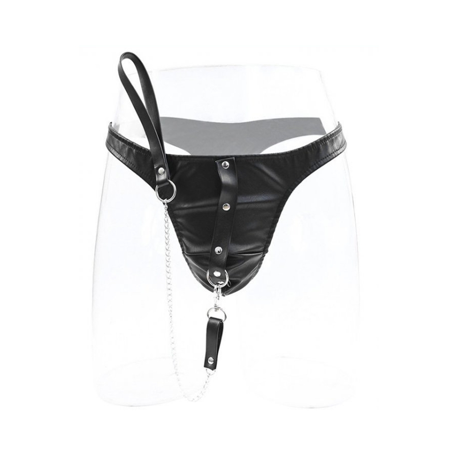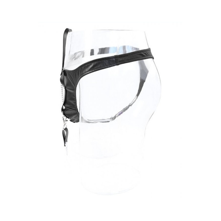 Ayez un look de soumission avec ce string fétish en simili cuir et sa laisse mesurant 40cm avec une poignée en simili également.